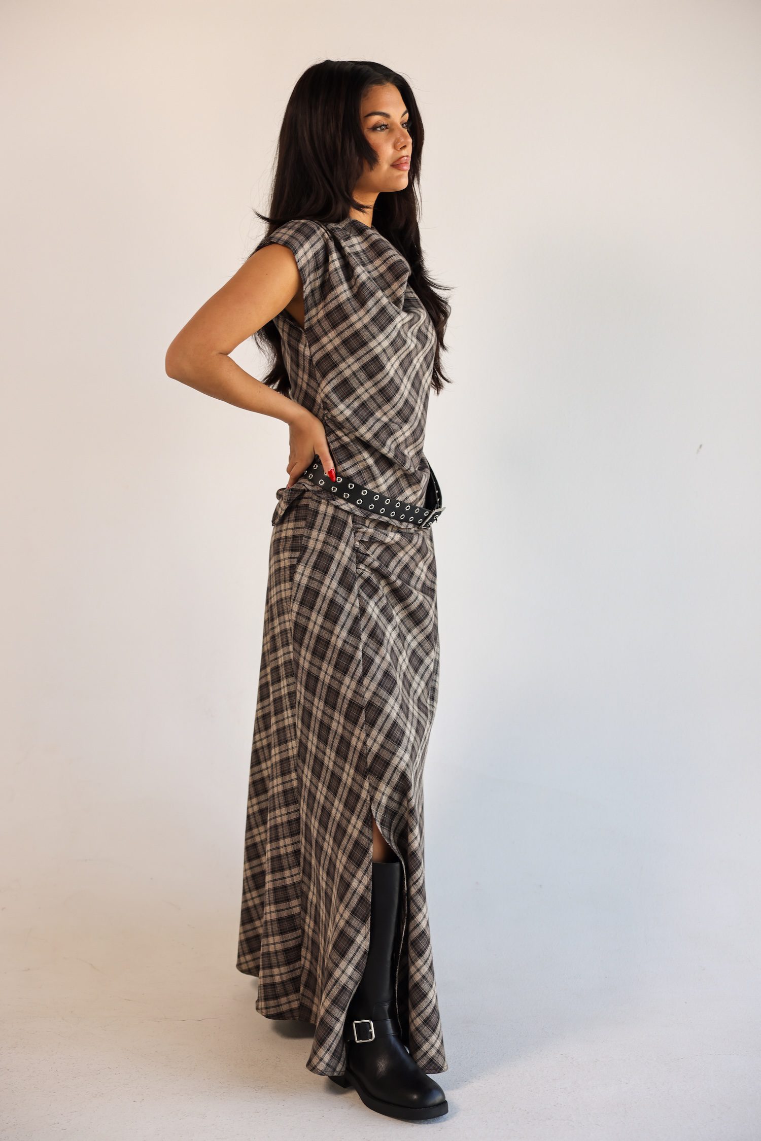 Effortlessly cool with a touch of timeless edge — this three-piece set includes a draped plaid top, matching full-length skirt, and a studded belt to cinch the waist and add attitude.