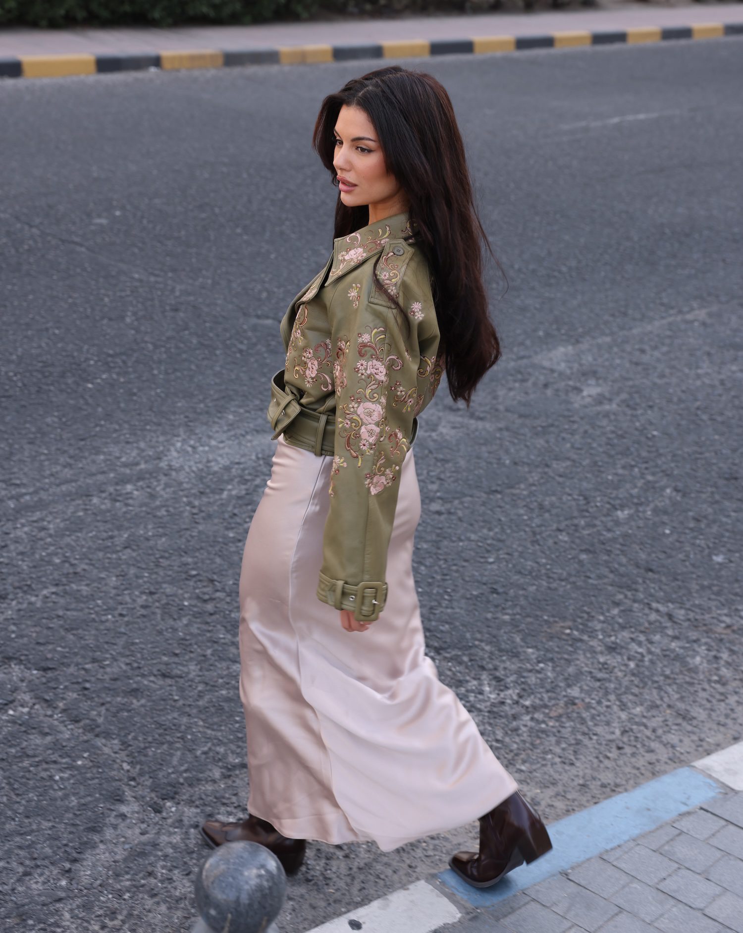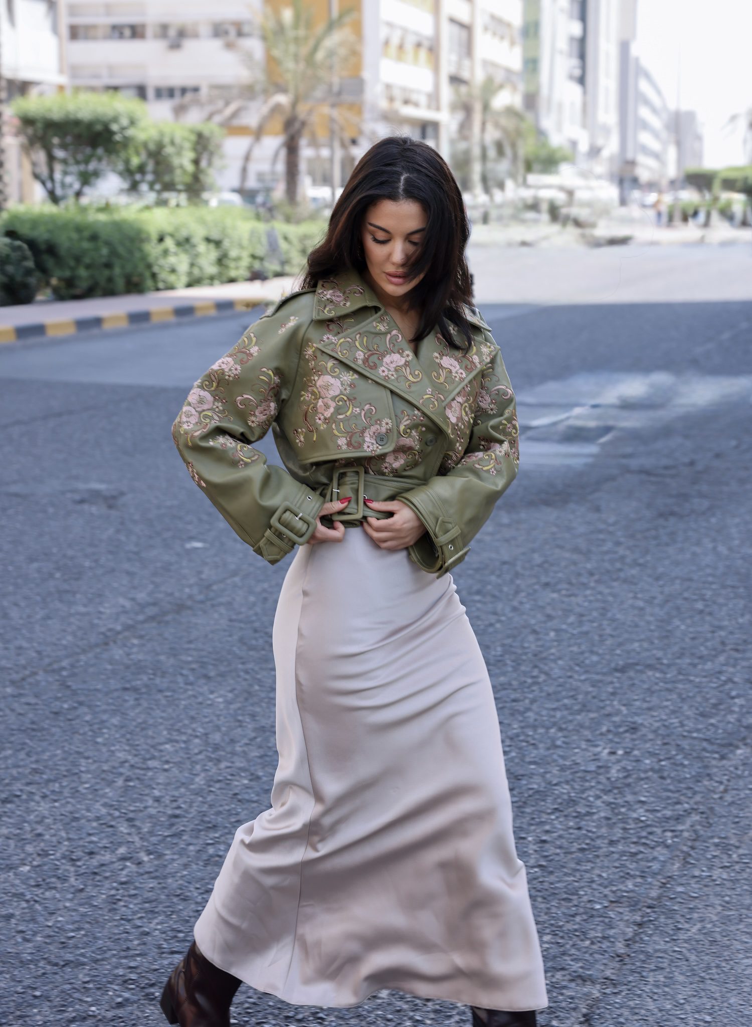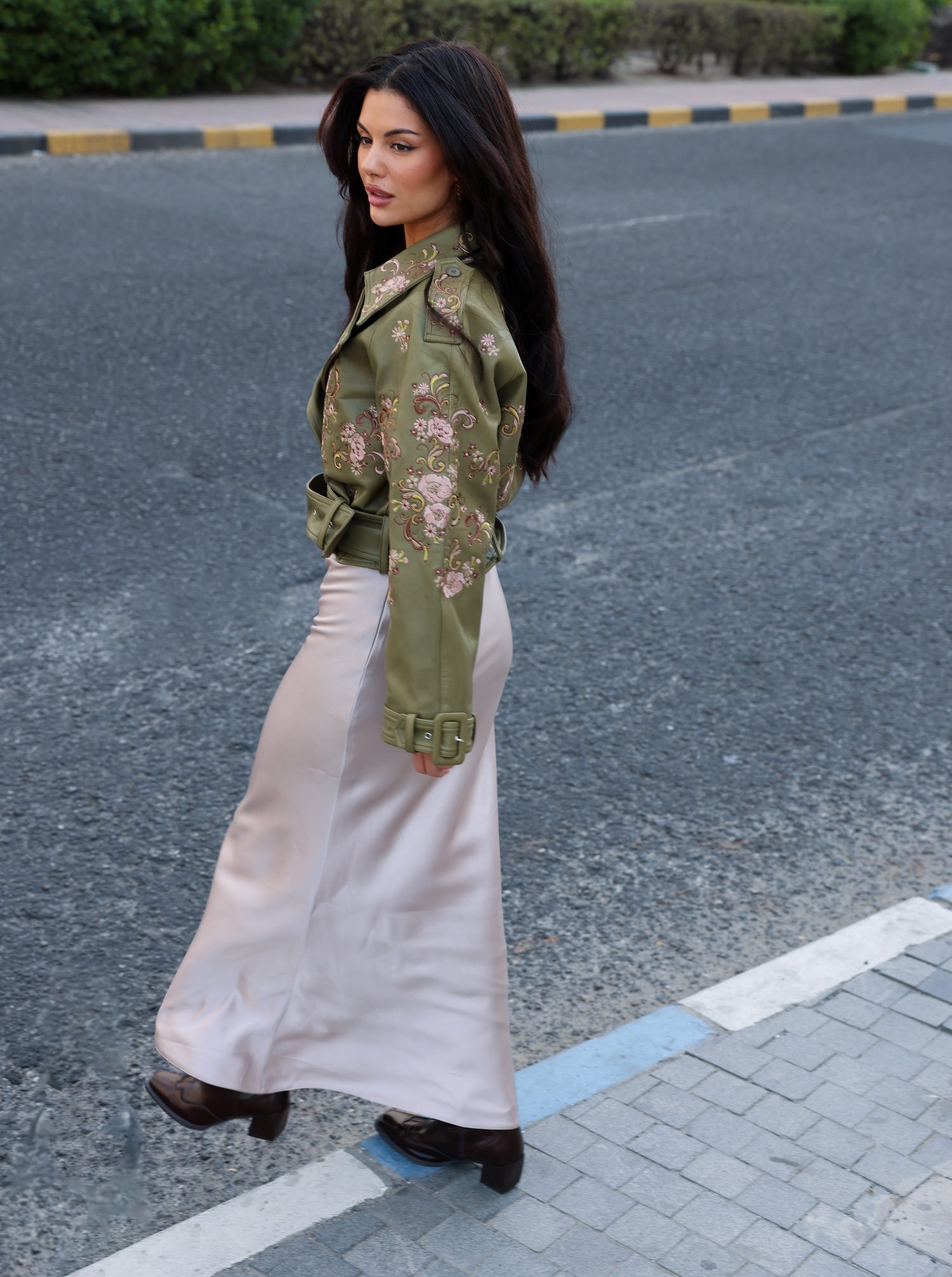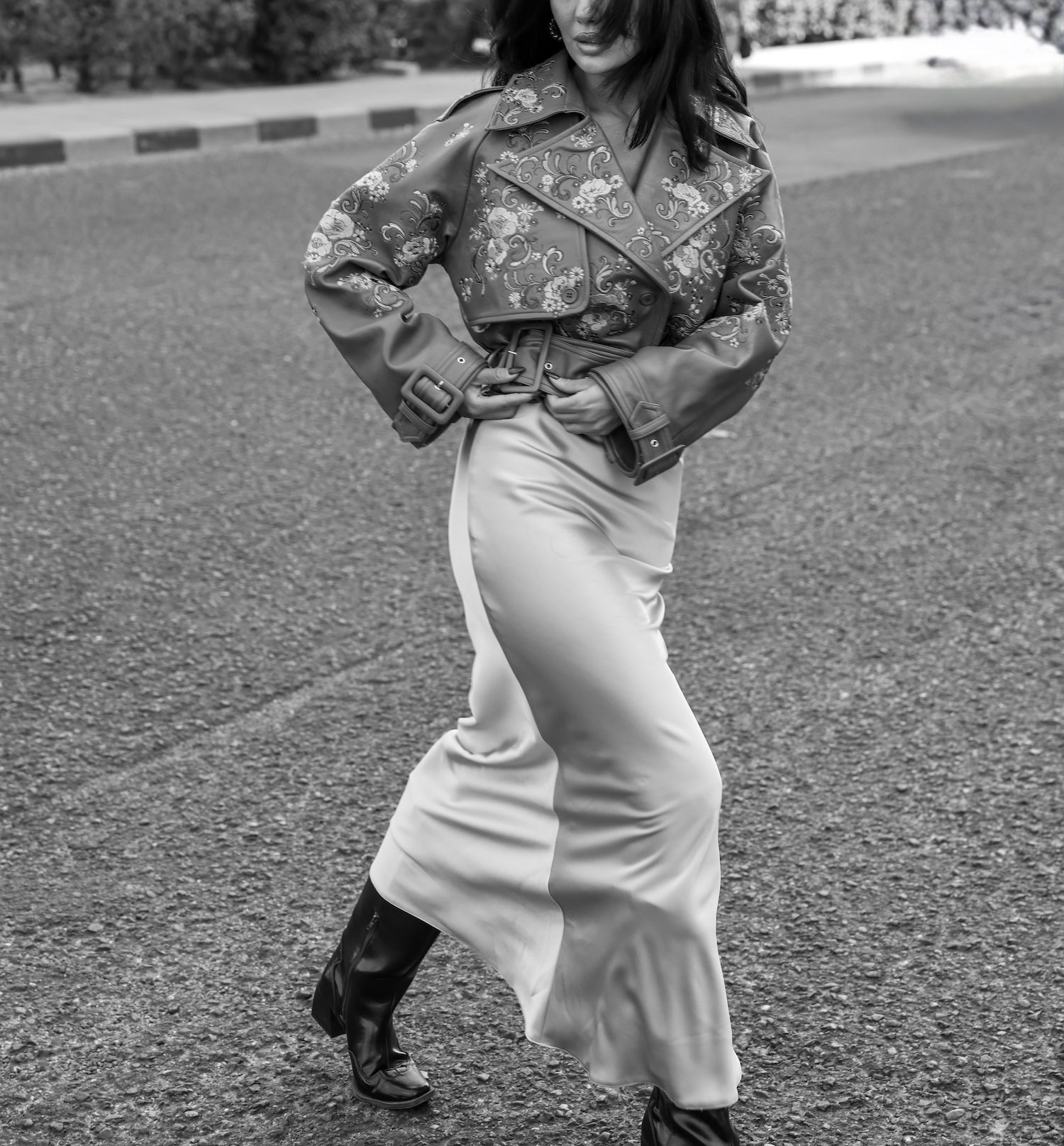 The statement real leather cropped trench is beautifully hand-embroidered, showcasing intricate floral detailing that brings soft romance to structured design. Paired with a sleek satin dress that drapes fluidly along the body, this set effortlessly blends edge and grace — perfect for the woman who moves with quiet confidence and undeniable presence.