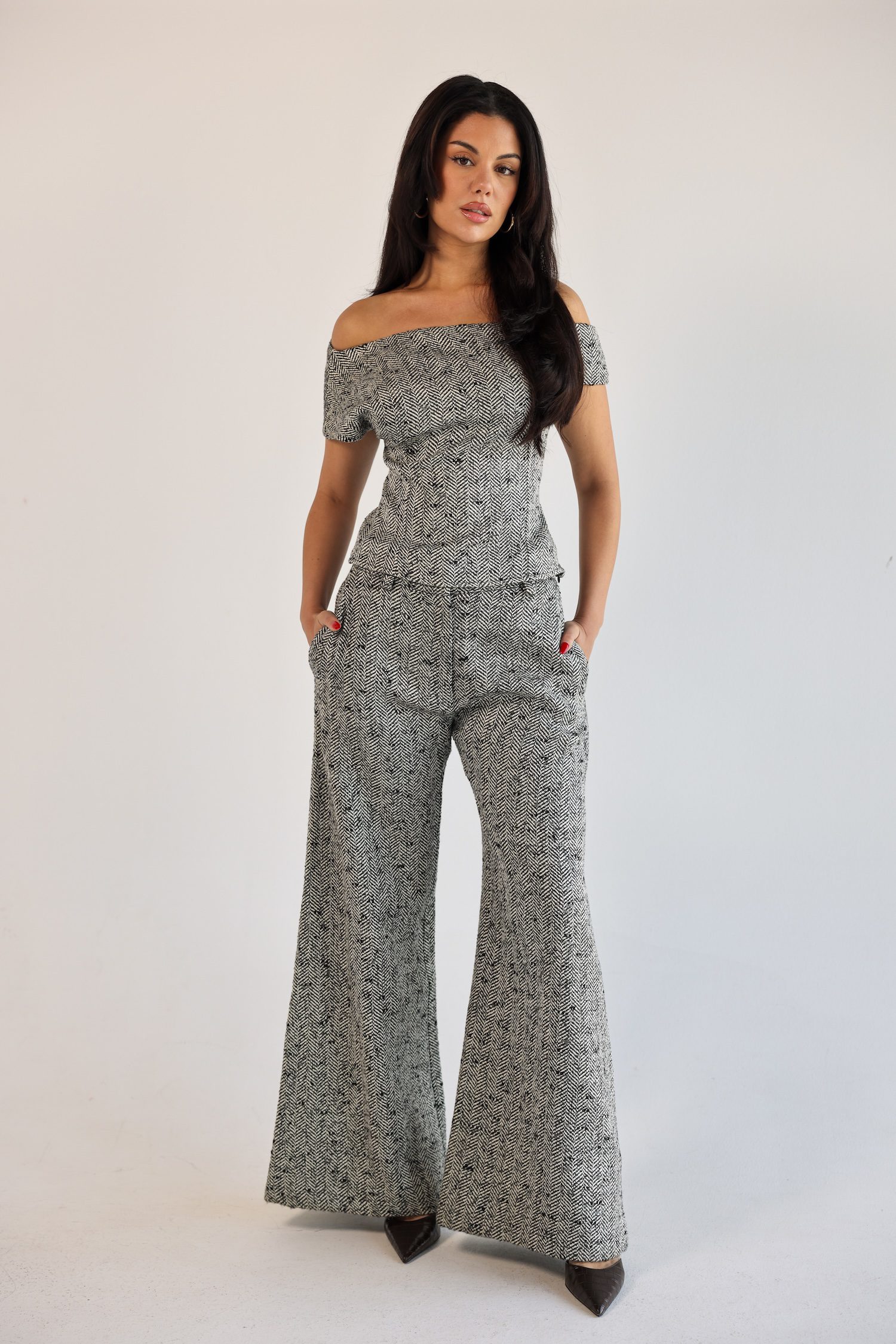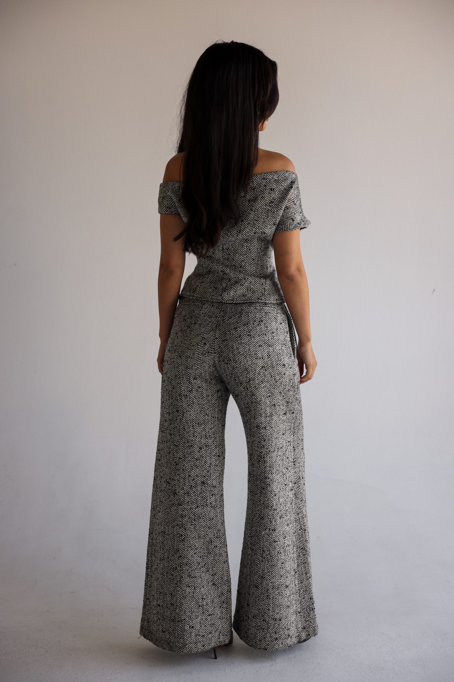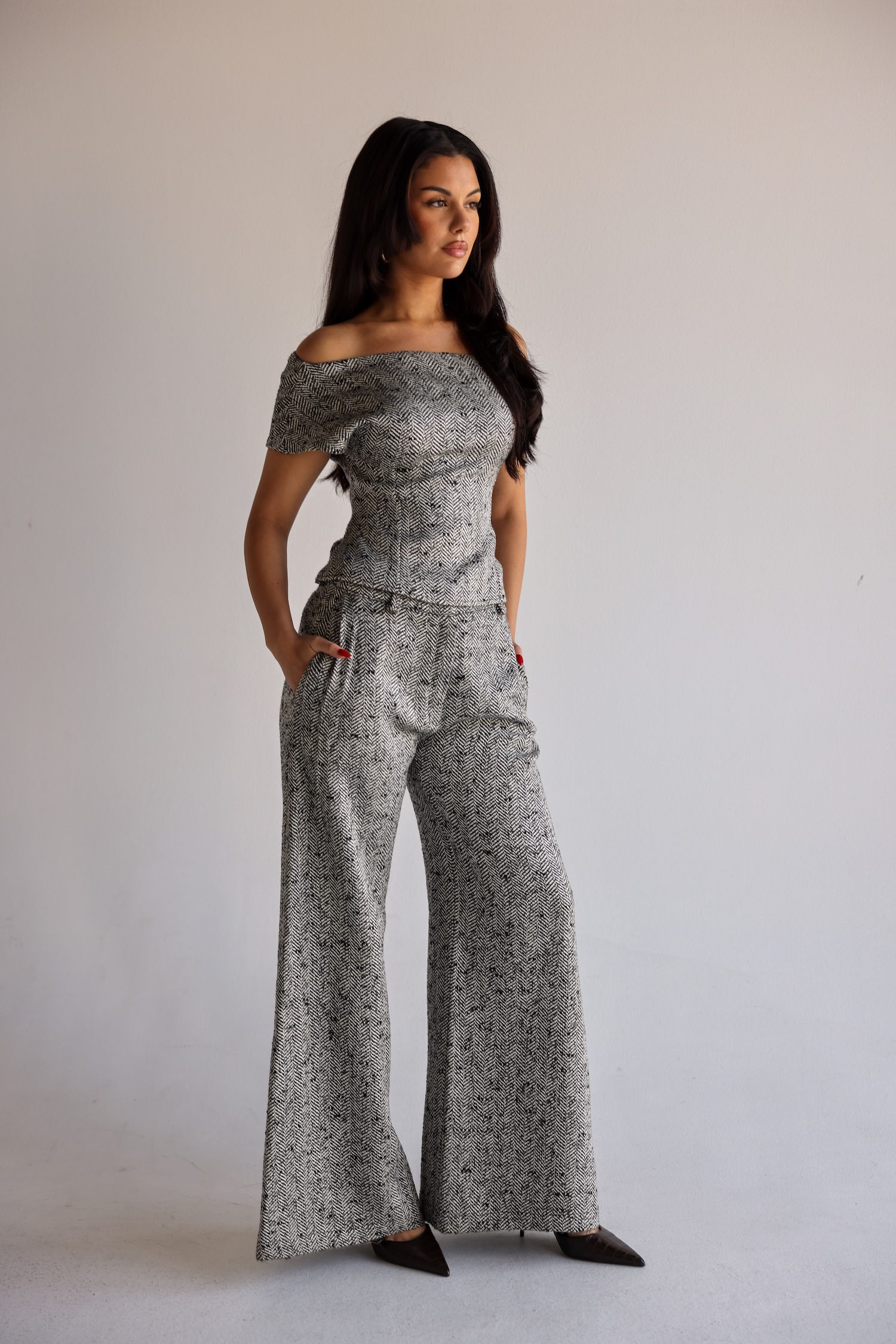 This two-piece ensemble features an off-shoulder structured top that accentuates the collarbone and sculpts the waist, paired with wide-leg trousers that create a fluid, elongated silhouette. Made from a softly textured tweed-inspired fabric, the NIA Set blends structure with comfort, draping beautifully while maintaining a refined finish.