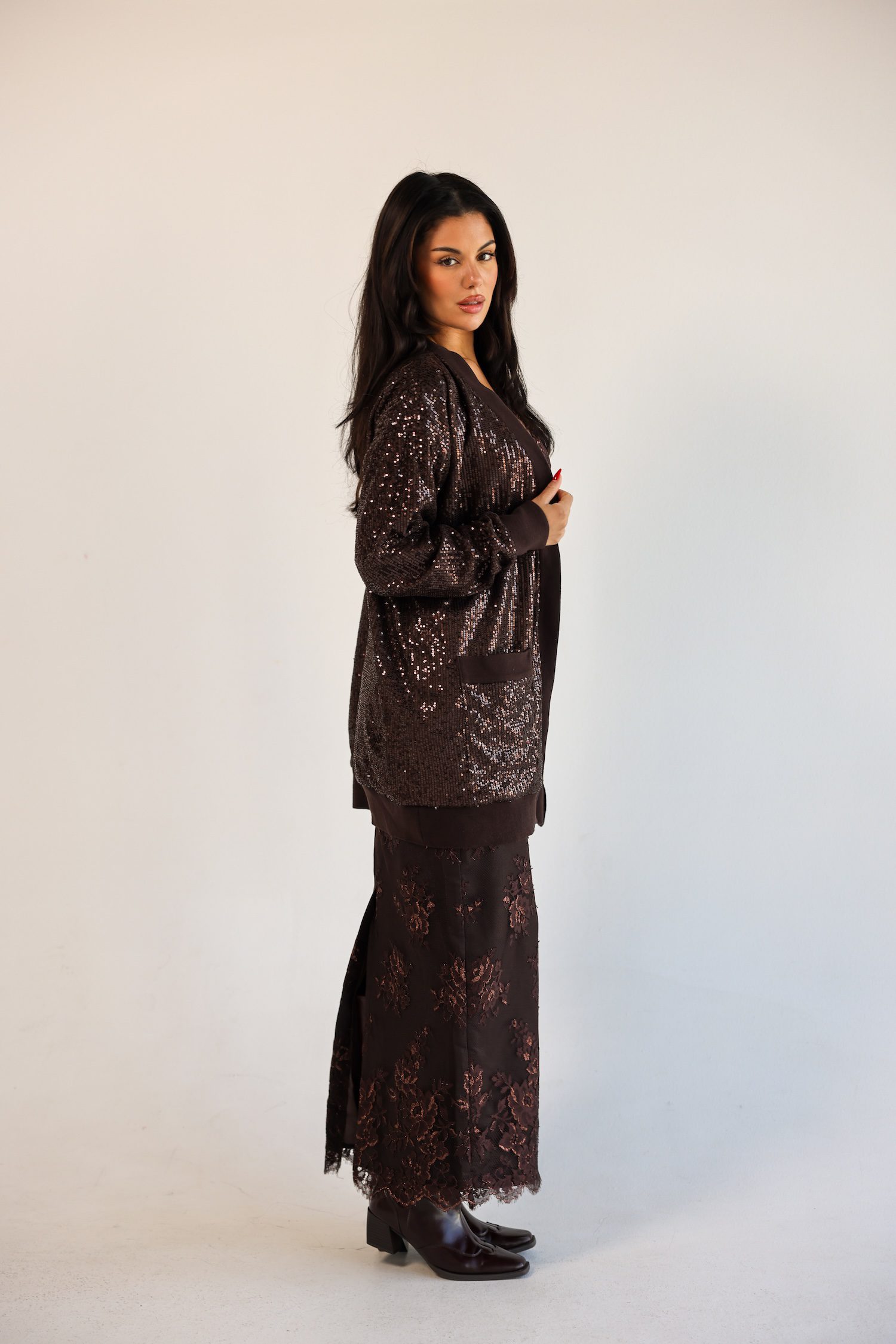 The NOUF Set fuses feminine allure with modern edge — a striking combination of texture, shimmer, and attitude. This ensemble features a form-fitting lace dress that sculpts the silhouette with romantic detail, paired with a sequin jersey bomber that adds effortless cool and subtle sparkle. The included belt defines the waist, balancing softness and structure in perfect harmony.